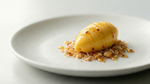 Preheat oven to 200°C (390°F). Cube the mango flesh and roast on a tray for 15–20 minutes until the edges are slightly caramelized. Blend into a smooth purée and mix with the lime juice. Chill completely before use.